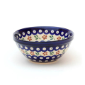 ポーリッシュポタリーの伝統的な「ピーコックアイ」と桜やコスモスを思わせる花のスタンプが組み合わさったハイスタンダード柄。絞られた色数と配色で、愛らしさがプラスされたバランスの良いパターンデザインです。同じくピーコックアイが用いられた166Aの柄と揃えて使う方も多く、組み合わせて贈り物としてのご利用もおすすめです。