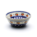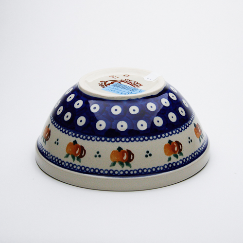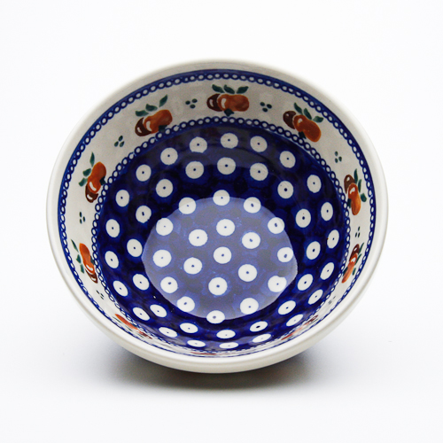 ポーリッシュポタリーの伝統的な「ピーコックアイ」から派生したザクワディらしいクラシック柄のバリエーション。オレンジ色の果実は実はりんご。ポーランド人なら誰しも間違いなくそう答えます。素朴で温かみのあるパターンデザインです。
