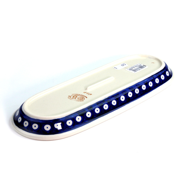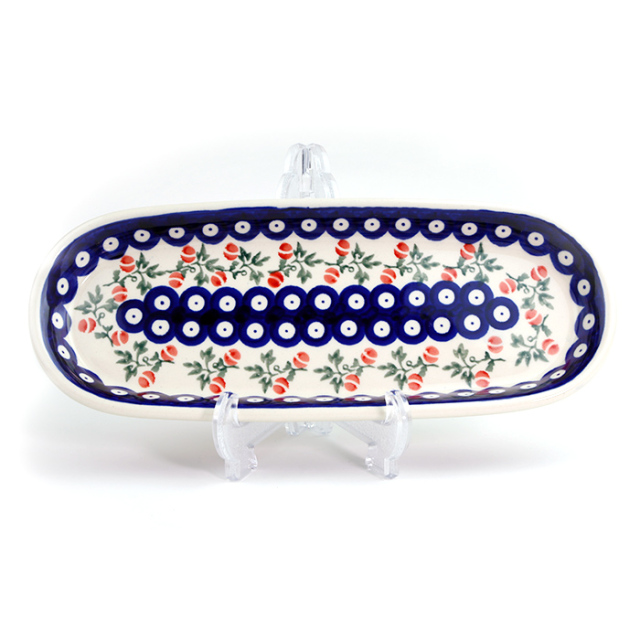 ポーリッシュポタリーの伝統的な「ピーコックアイ」から派生したザクワディらしいクラシック柄のバリエーション。伝統的なピーコックのデザインにふっくらした桃のような果実の組み合わせが何とも可愛い雰囲気を出しています。クラシック過ぎない可愛らしさがお好みの方には是非お勧めしたいパターンデザインです。