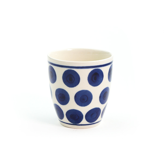 濃紺の単色使いのドット柄は、ポップで明るい印象です。カップやボウルなどの立体的なフォルムでは元気で可愛らしく、またプレートなどのフラットなフォルムではお洒落な雰囲気。シンプルなパターンデザインの持つ洗練を感じます。