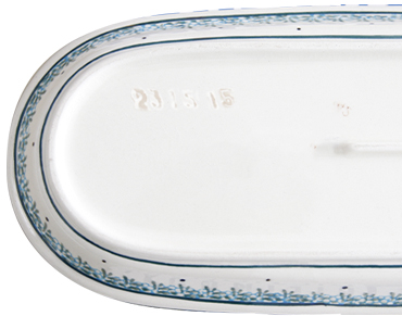 石膏型から外し、凹凸をなくす作業の中で、湿らせたスポンジで表面を均一にし細かな陶土粉を落としたりする工程があります。この時に表面に水跡が付き、絵付けの無い生地の部分に線のようにうっすらと見えます。