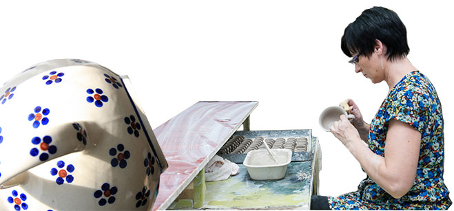 ポーリッシュポタリーはスタンプ押し、絵筆での手描き、またその組み合わせで絵付けされます。そして、それは職人の手によってひとつひとつ行われる作業で、この食器の最も重要な要素であると、製造元各社が位置付けています。スタンプや手描きの絵柄は、量産用の転写や印刷によっての絵付け(いわゆるプリントもの)とは異なり、同じ絵柄でもひとつひとつに違いが見られるところが大きな魅力です。