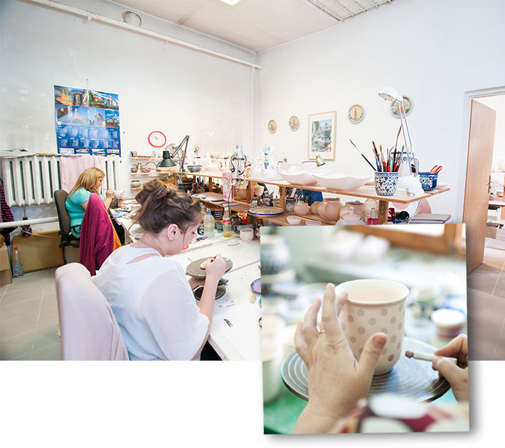 スタンプや筆による手描きなど、様々なパターンの絵付けがなされます。